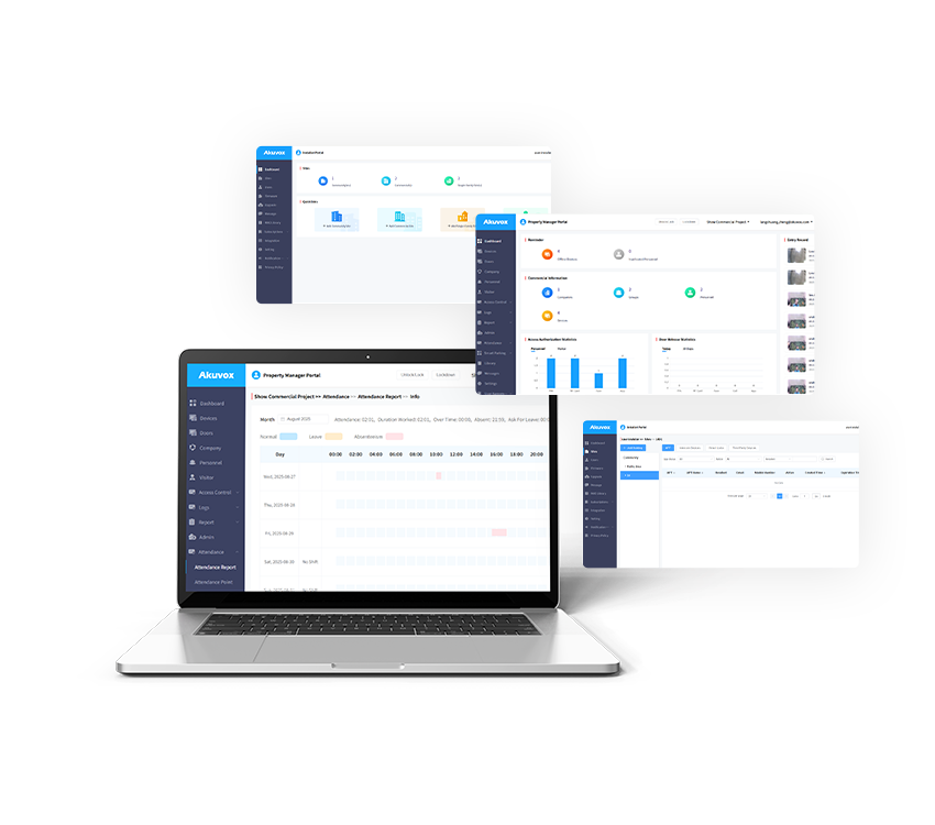 Cloudový portál Akuvox poskytuje vzdálený přístup přes webové rozhraní pro správu více poboček a společností z jednoho centrálního bodu. Je dostupný odkudkoli s internetovým připojením a nabízí komplexní kontrolu nad: