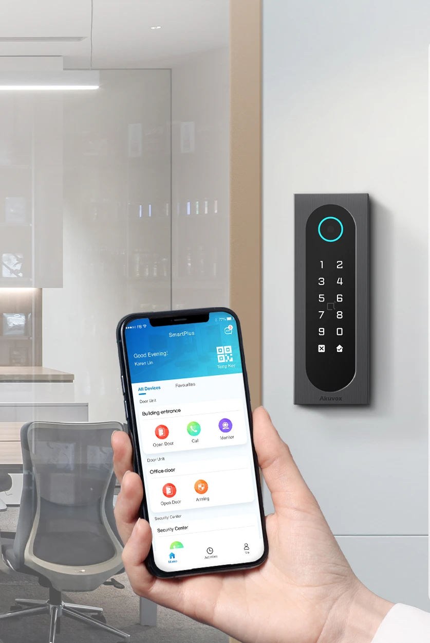 Akuvox Smart Access zahrnuje systémy kontroly vstupu i interkomů pro videokomunikaci, vše spravované na dálku prostřednictvím počítače s webovým prohlížečem nebo mobilní aplikací.
