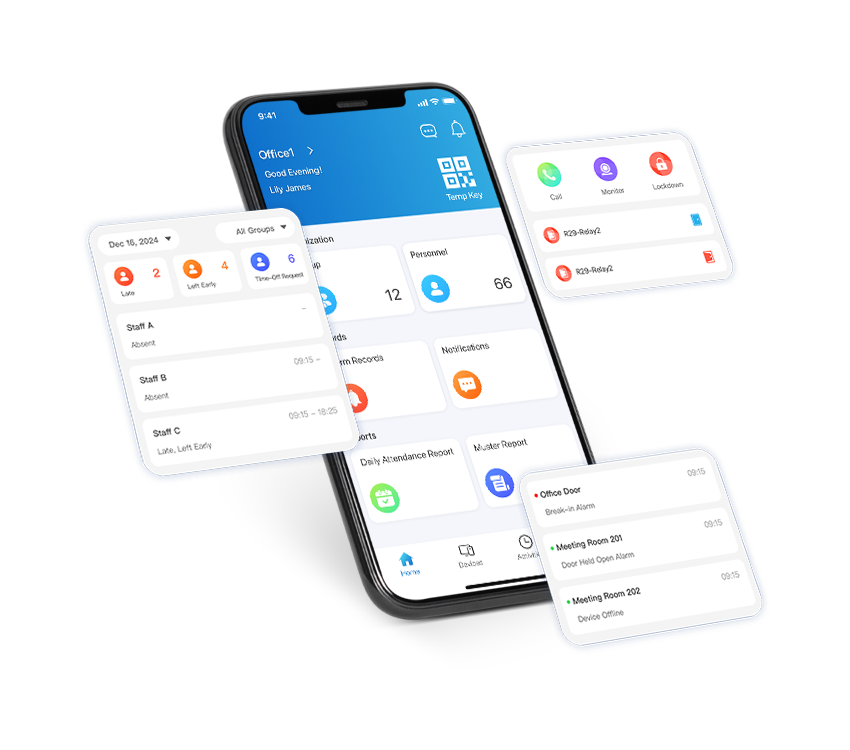 V případě nouze systém Akuvox Smart Access automaticky odemkne všechny dveře, generuje nouzové hlášení a logy pro administrátory a odesílá oznámení v reálném čase do mobilních aplikací zaměstnanců.