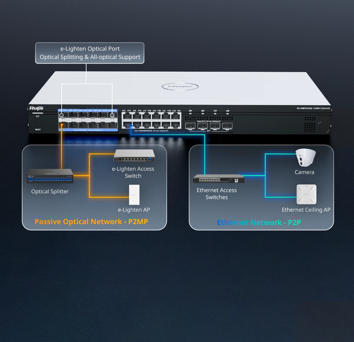 Společnost Ruijie Networks představuje ucelnou řadu produktů, které v rámci jednoho systému podporují jak pasivní plně optickou síť LAN (P2MP), tak konvenční Ethernet (P2P). Řešení zjednodušuje síťování a ladění PASIVNÍCH optických sítí LAN a vyžaduje minimální školení systémových integrátorů. Rujie e-Lighten Optical Solution je určeno pro podniky všech velikostí a podporuje rozmanité síťové požadavky prostřednictvím přizpůsobitelných metod přístupu.