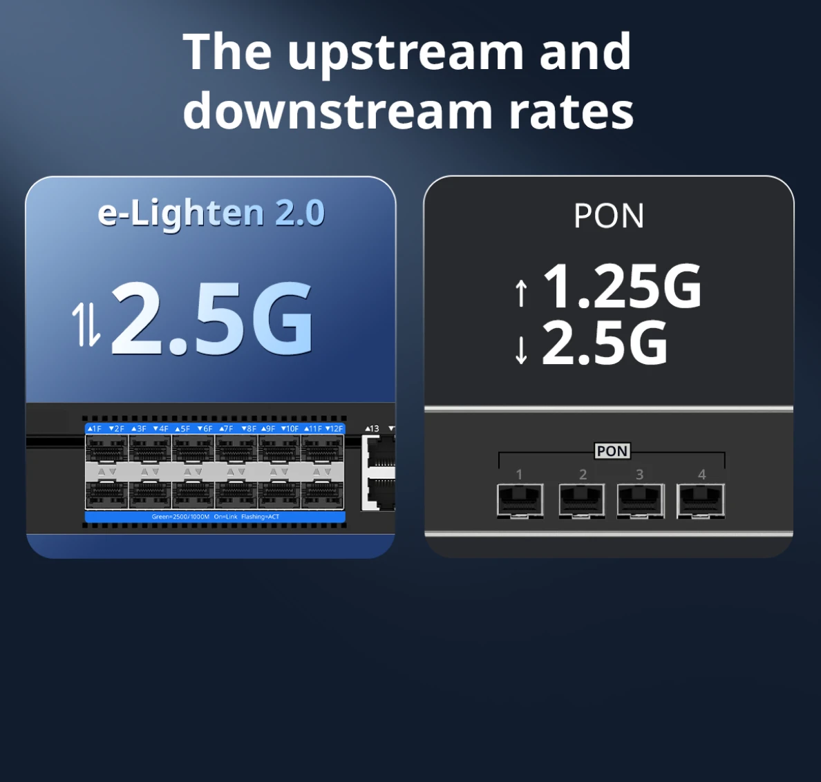 Řešení e-Lighten Optical podporuje PON (P2MP) i Ethernet (P2P) v jednom systému, což zjednodušuje síťování a ladění – ideální pro podniky s rozmanitými síťovými potřebami.