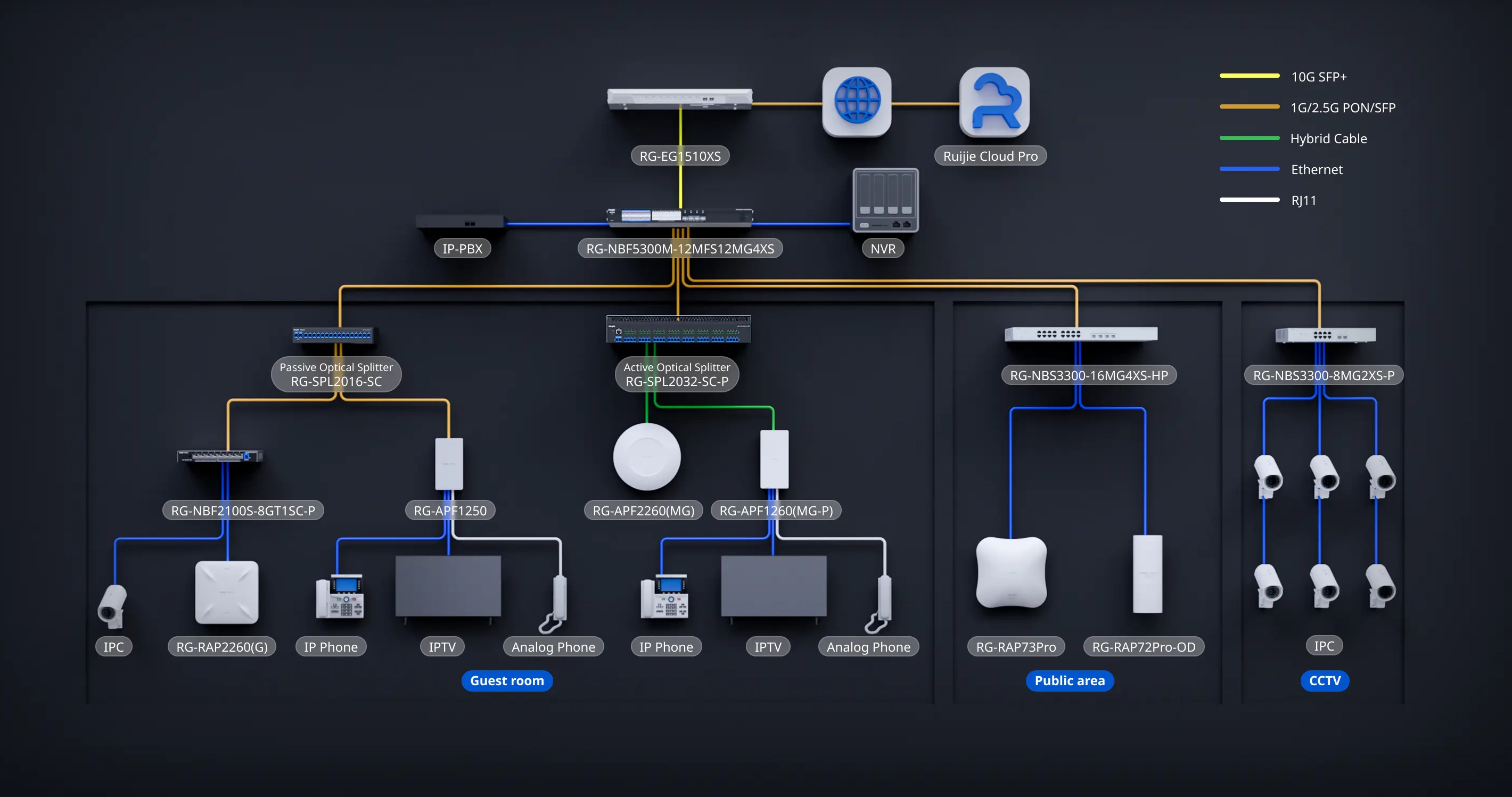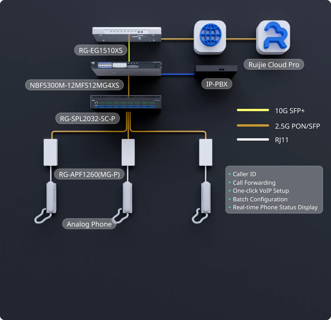Toto řešení umožňuje správu Ethernet PON a cloudu, čímž snižuje prahové hodnoty konfigurace OLT a náklady na správu. Správa Ruijie Cloud založené na umělé inteligenci zvyšuje provozní efektivitu a spolehlivost sítě.