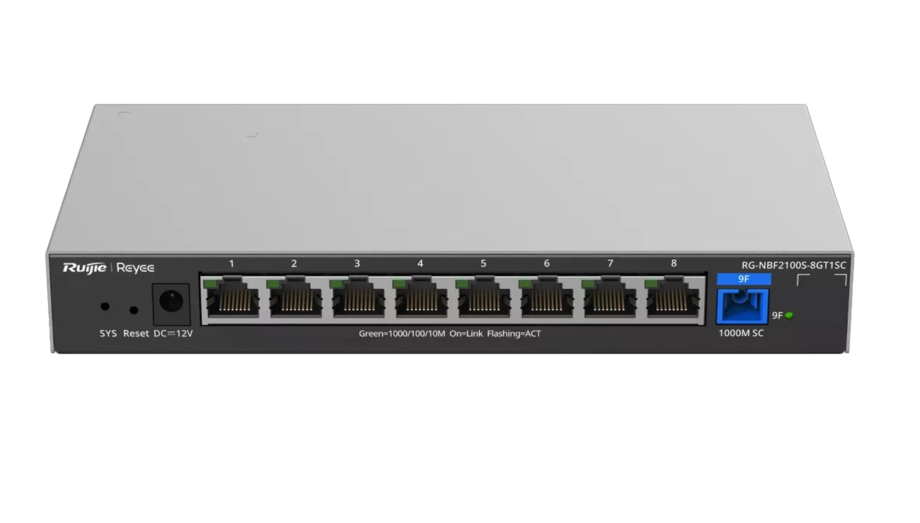Ruijie e-Lighten RG-NBF2100S-8GT1SC je gigabitový řízený optický přístupový switch (ONU), podpora PON, 8 ethernetových portů 10/100/1000BASE-T, 1 port 1G SC. Podporuje vzdálený restart portu, vzdálený restart přepínače, přiřazení VLAN, izolaci portů, DHCP Snooping. Spravovatelný pomocí aplikace Ruijie a Ruijie Cloud.