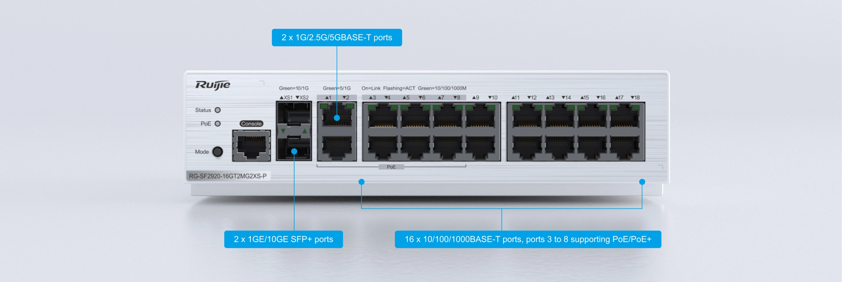 16 x 10/100/1000M PoE+, 2 x 1000M/2.5G/5G, 2 x 1G/10G SFP+