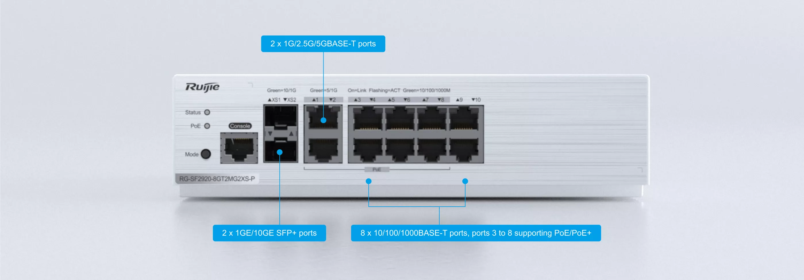 8 × 10/100/1000 Mbps, 2 × 1G/2.5G/5G s PoE+